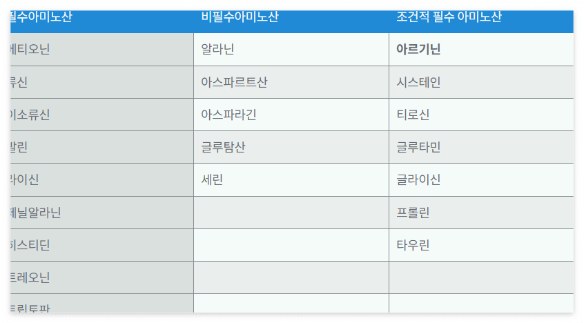 아미노산 종류에는 3가지가 있는데 생체 내에서 합성이 불가능하여 외부로부터 섭취, 공급 되어야 하는 아미노산 9종과 체내에서 쉽게 합성되는 아미노산 5종, 일반적이 상황에서 체내 합성이 되도 특정 생리 상태에서 그 합성이 제한 될 수 있는 아미노산 7종으로 나누어진다.